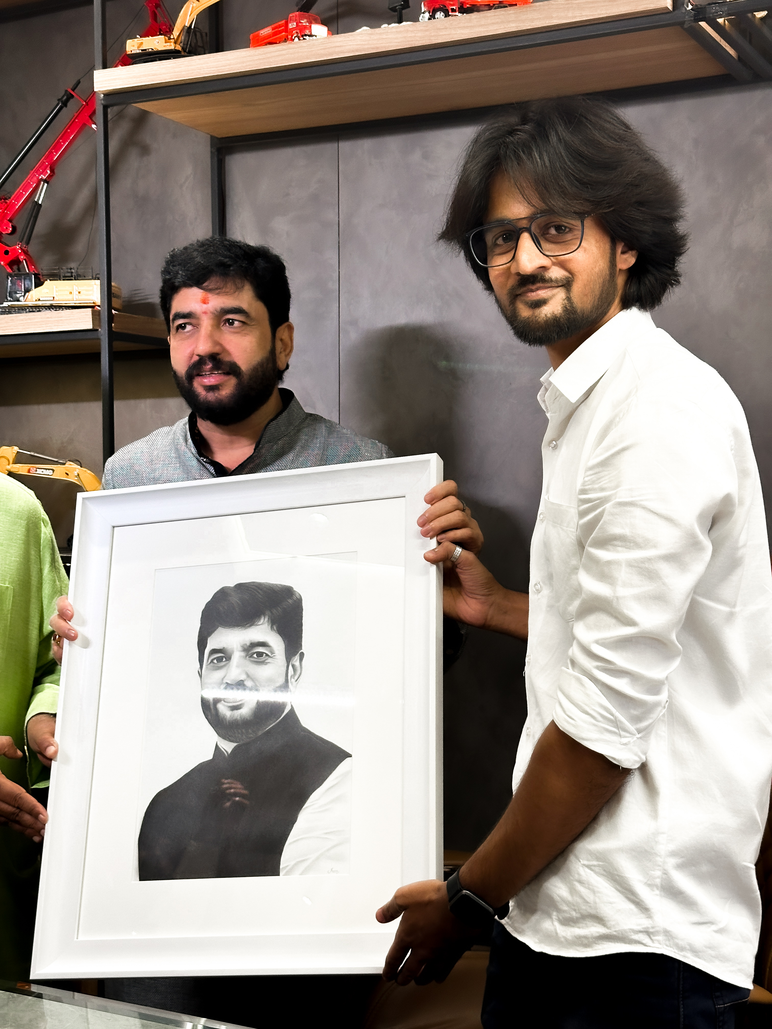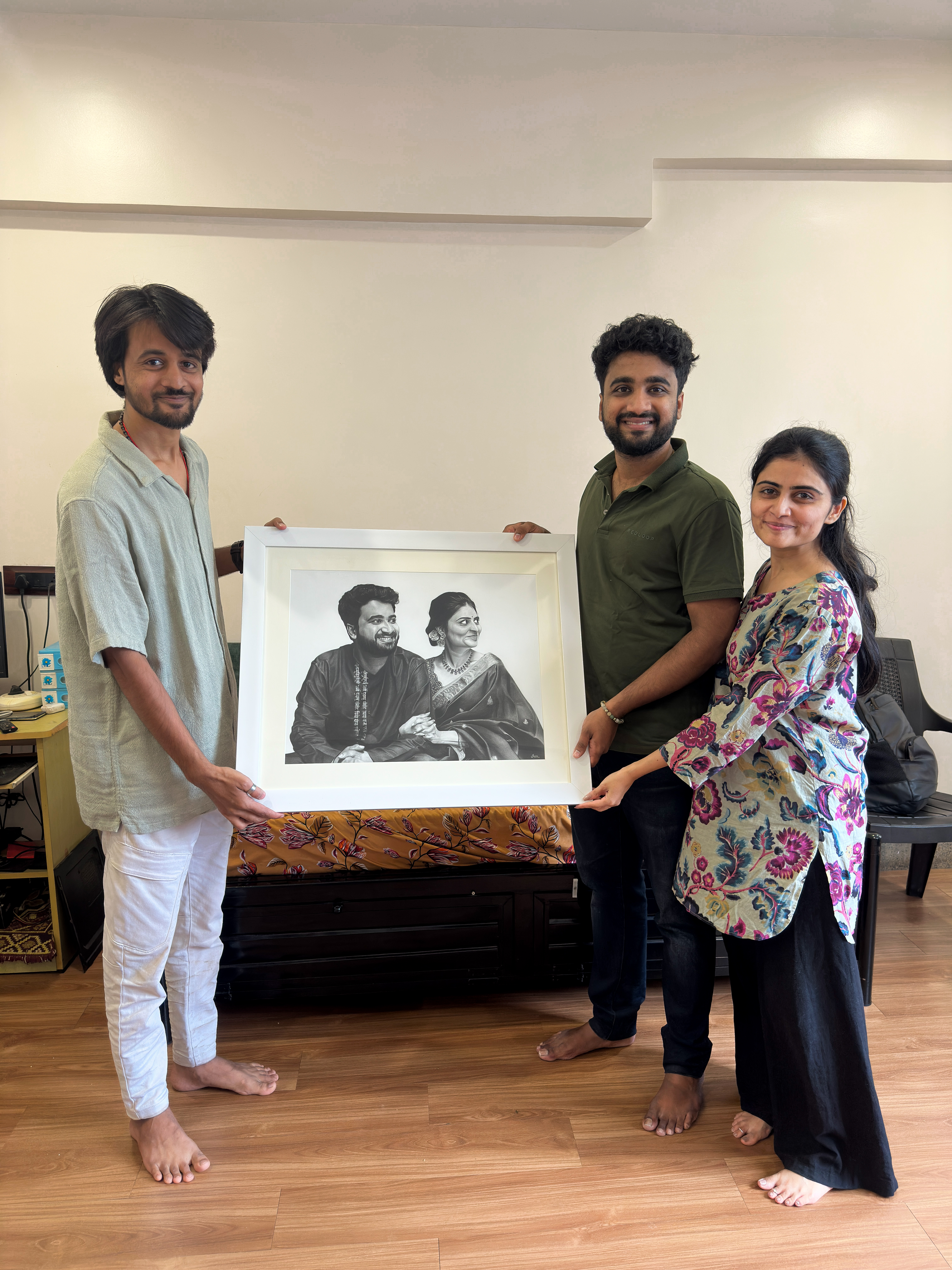 During this meeting, I had the honour of presenting him with a charcoal portrait depicting him with his mother. The artwork was created with great sensitivity, keeping in mind not just likeness, but emotion and memory. As soon as he saw the portrait, the moment turned profoundly emotional. His reaction made it clear that the artwork had touched a very personal space in his heart.